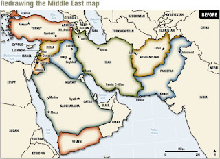 Les cartes présentées en illustration sont extraites de "Blood Borders, redrawing the Middle-East" projet du lieutenant-colonel américain Ralph Peters, la première représente les frontières actuelles, la seconde les frontières modifiées selon les données confessionnelles et ethniques.